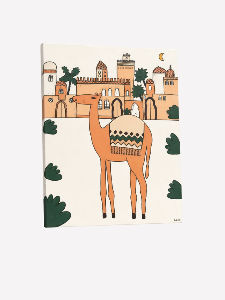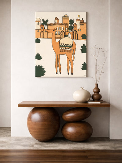Ten obraz przenosi nas w świat orientalnej tajemnicy i wewnętrznej siły. Centralna postać wielbłąda to artystyczna interpretacja jogowej równowagi i stabilności, nawiązująca do asan pomagających odnaleźć swoje centrum. Stonowana, ciepła paleta barw – odcienie terakoty i piaskowego ecru – wprowadza nastrój spokoju i medytacji.