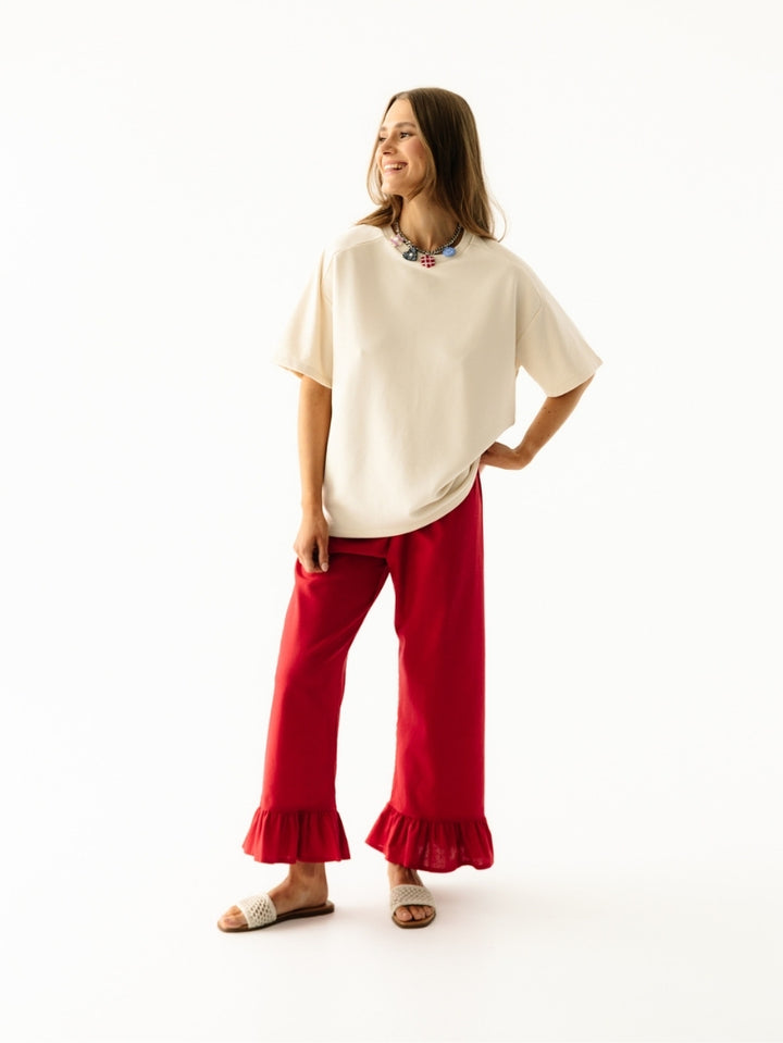 Aby spodnie zapewniały komfort i jednocześnie przetrwały dłużej niż jeden sezon, warto wybierać przede wszystkim wysokiej klasy materiały. W JOYINME w większości przypadków korzystamy z bawełny pochodzącej z organicznych upraw, a wszystkie nasze produkty posiadają certyfikat Oeko-Tex®.