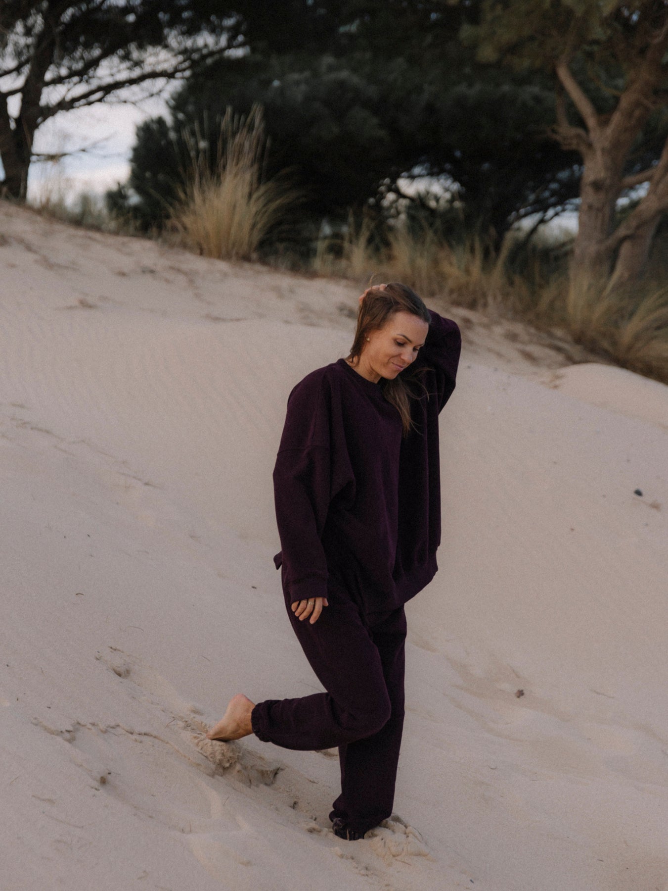 Bordowe, luźne bawełniane spodnie dresowe KIND - zestaw ze stanikiem do jogi