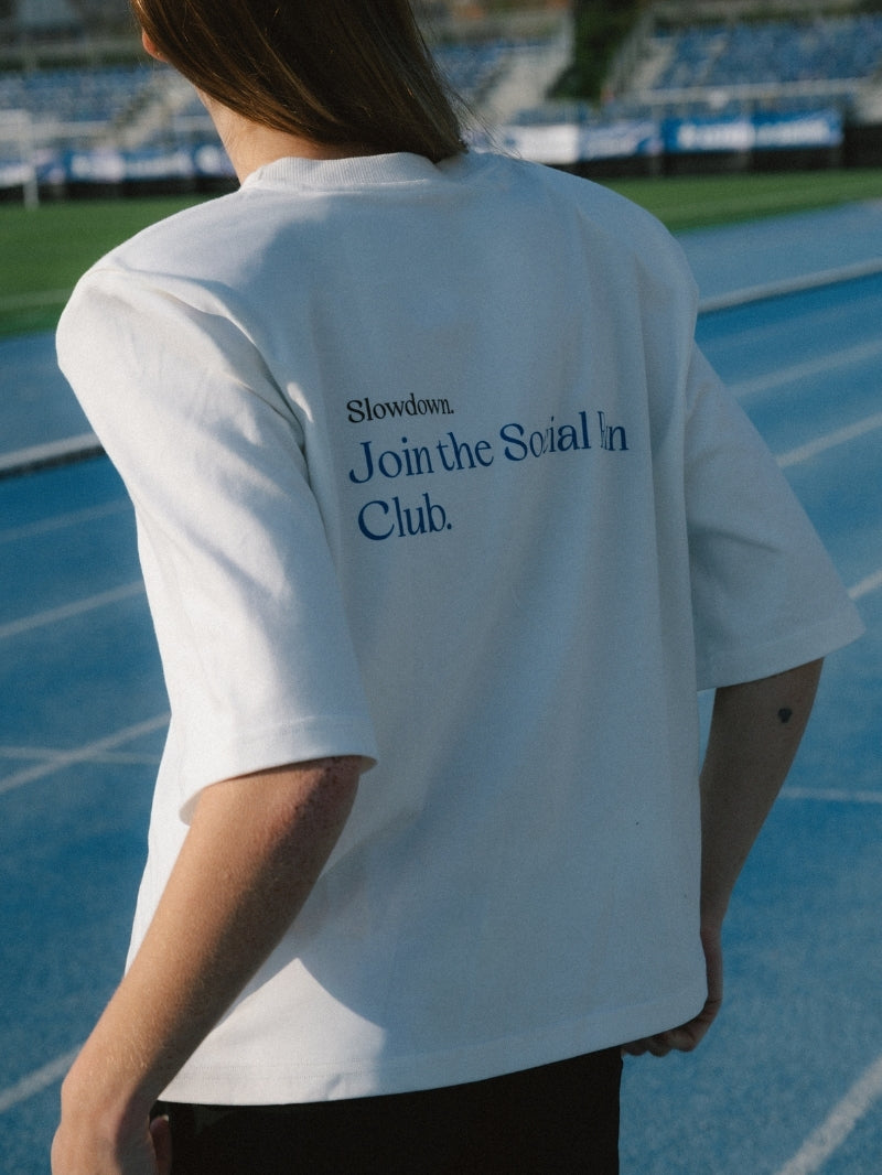 T-shirt Run Club to odpowiedź na potrzeby kobiet, które szukają w modzie czegoś więcej niż tylko wygody – szukają tożsamości. Ten model, uszyty z mięsistej bawełny o wysokiej gramaturze, zachowuje swój kształt przez cały dzień i nie prześwituje. Klasyczny, luźniejszy krój z przedłużonym rękawem zapewnia pełną swobodę, a autorska grafika na plecach „Slowdown. Join the Social Run Club.” w kolorze niebieskim nadaje mu autentycznego, klubowego charakteru.